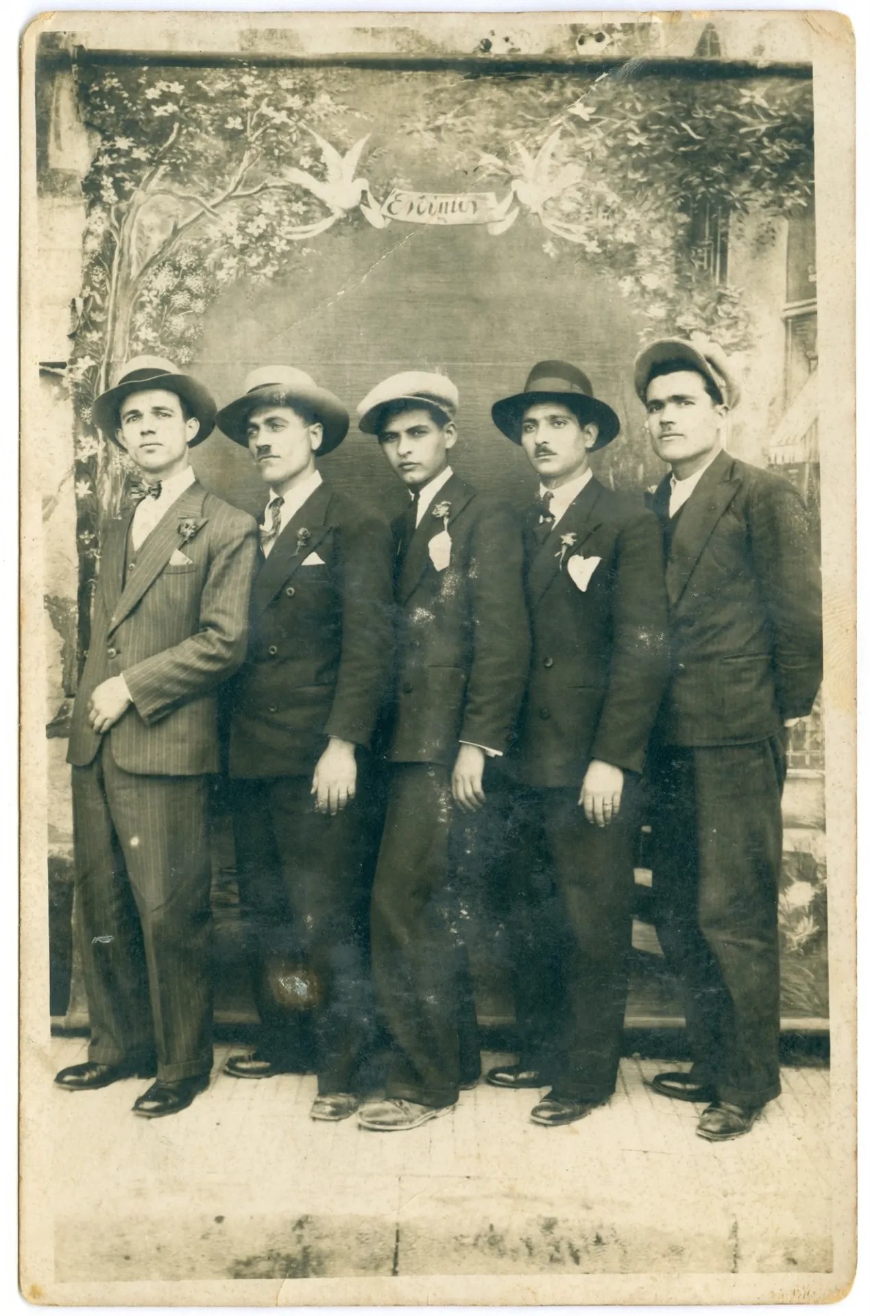 Κορίτσια µε καταγωγή από τον Κιρκιντζέ και άλλες περιοχές της Μικράς Ασίας μαθαίνουν ραπτική· γάμος σε οικογένεια Μικρασιατών από τα Μούγλα· πορτρέτο πέντε ανδρών στον δρόμο μπροστά από λαϊκότροπο ζωγραφικό φόντο με τη λέξη «Ενθύμιον».